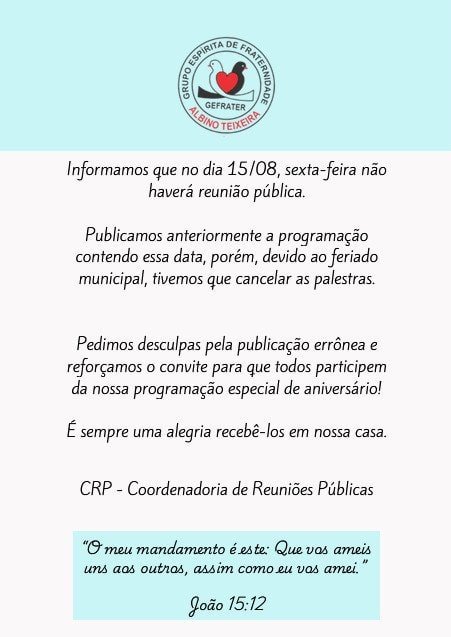 Início / Informes / 13 a 20/08: Programação de Reunião Pública