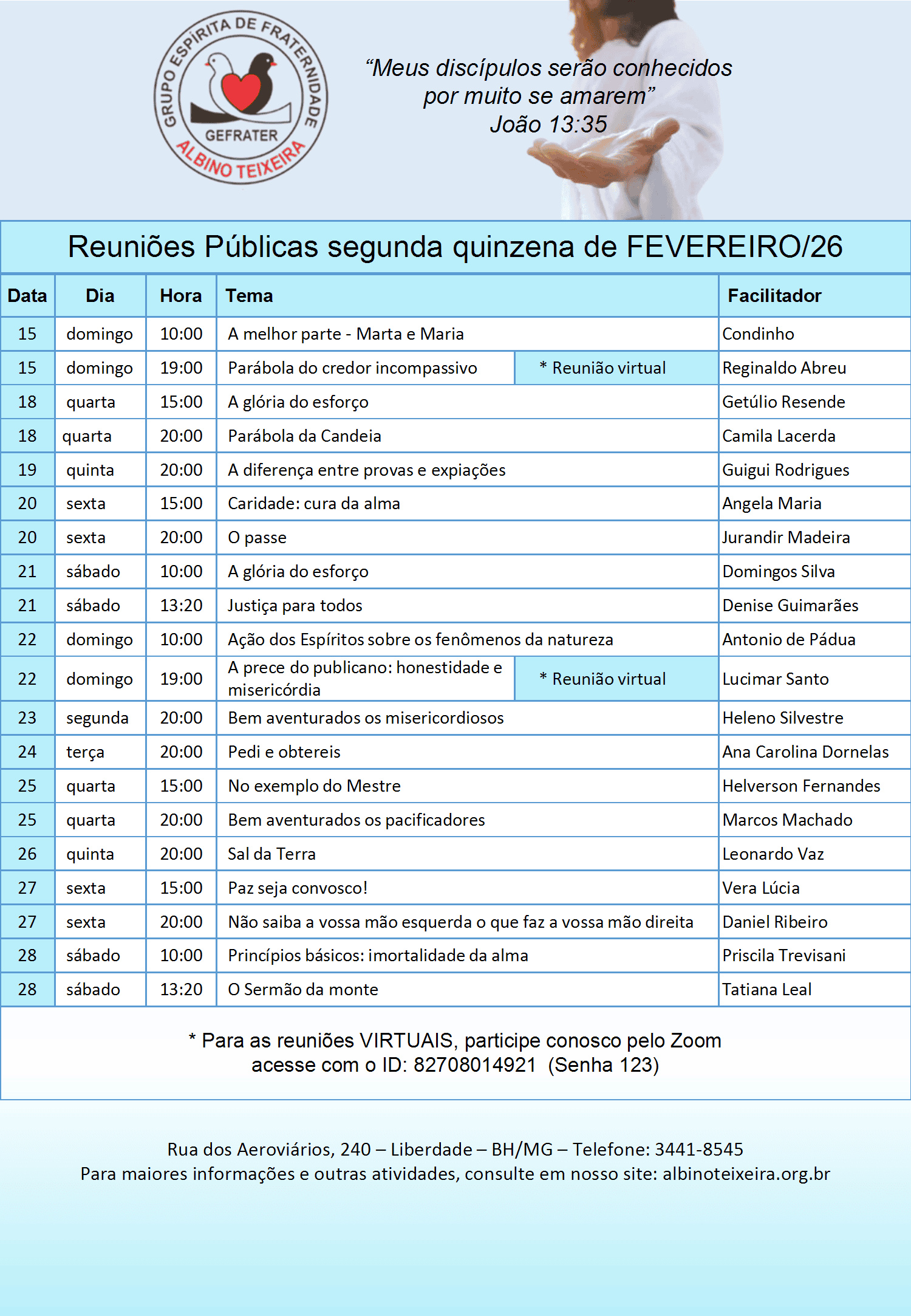 Reuniões públicas: segunda quinzena de fevereiro de 2026