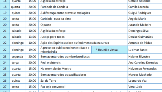 Recent Posts 13 de janeiro de 2026 Categorias:Informes 16 à 31/01: Programação de reunião pública Leia mais 23 de dezembro de 2025 Categorias:Informes 01 à 15/01: Programação de reunião pública Leia mais 21 de dezembro de 202521 de dezembro de 2025 Categorias:Informes 16 à 30/12: Programação de reunião pública Leia mais 1 de dezembro de 20251 de dezembro de 2025 Categorias:Informes 01 à 15/12: Programação de reunião pública Leia mais See the archive Sermons Paulo de Tarso o Apóstolo do Cristo Gefrater Grupo Espírita de Fraternidade Albino Teixeira 25 de julho de 2020 Facilitador George ValadãoReunião Pública Assistir Archive of Sermons Sermons Os Quinhentos da Galileia Gefrater Grupo Espírita de Fraternidade Albino Teixeira 7 de agosto de 2020 Facilitador José MárcioReunião Pública Assistir Archive of Sermons Sermons Crise: oportunidade de crescimento Gefrater Grupo Espírita de Fraternidade Albino Teixeira 8 de agosto de 2020 Facilitador Marcondes SoaresReunião Pública Assistir Archive of Sermons Sermons Francisco de Assis nas Terras de Apolo Gefrater Grupo Espírita de Fraternidade Albino Teixeira 15 de agosto de 2020 Facilitador Roberto do CarmoReunião Pública Assistir Archive of Sermons Sermons História de Albino Teixeira e do Gefrater Gefrater Grupo Espírita de Fraternidade Albino Teixeira 19 de agosto de 2020 Homenagem Assistir Archive of Sermons Sermons Inclusão e acessibilidades na Casa Espírita Gefrater Grupo Espírita de Fraternidade Albino Teixeira 16 de novembro de 2022 Facilitadora Heliane Alves CarvalhoSeminário Assistir Archive of Sermons jan 1 1 de janeiro-15 de janeiro Reuniões públicas: primeira quinzena de janeiro jan 16 16 de janeiro-31 de janeiro Reuniões públicas: segunda quinzena de janeiro Ver Calendário